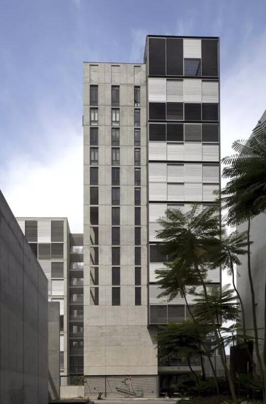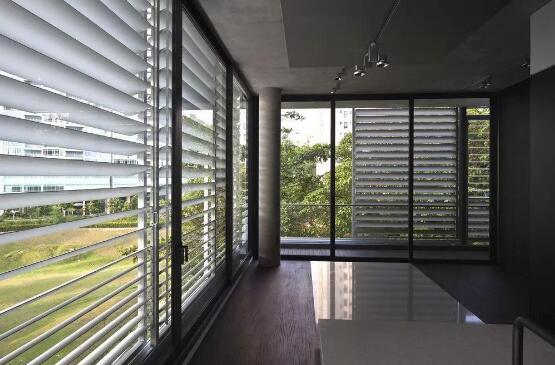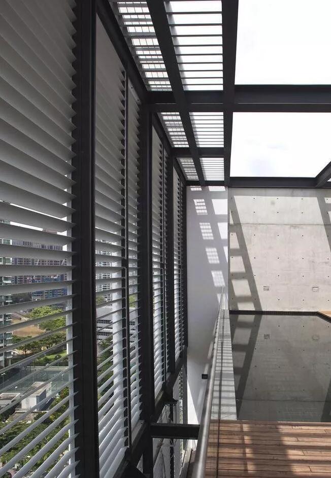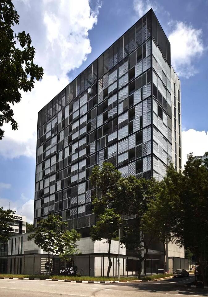 相較于日本這座充滿設(shè)計風(fēng)格的百葉窗建筑,在新加坡有一座“沒有風(fēng)格”的公寓樓也同樣是利用鋁百葉窗來遮陽的。