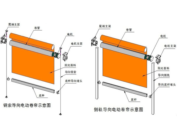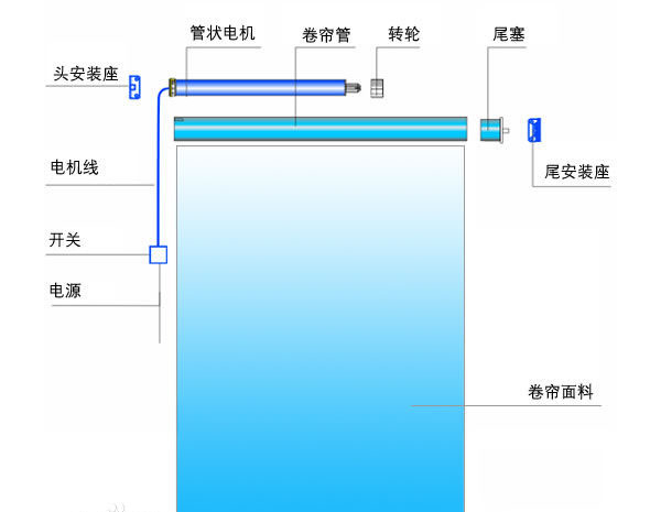 驅(qū)動電機(jī)、遙控器、控制器、卷管、遮陽面料、安裝支架、下低桿、傳動機(jī)構(gòu)。